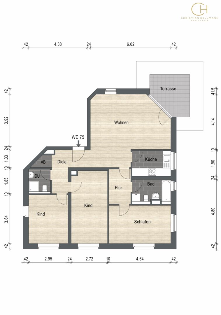 WE75: 95,00 m², EG, 4 Zimmer, Küche, 2 Bäder, Terrasse, vermietet seit 2022, m²-Miete 15,79 €