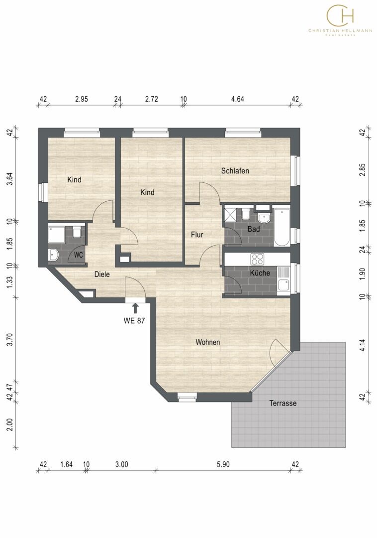 WE87: 95,00 m², EG, 4 Zimmer, Küche, 2 Bäder, Terrasse, vermietet seit 2018, m²-Miete 12,00 €