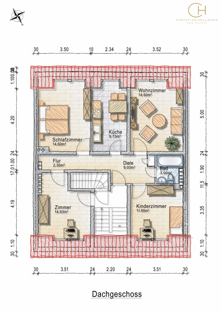 Zusätzlich bietet der nicht ausgebaute Spitzboden weiteres Ausbaupotenzial, z. B. für eine zusätzliche Wohneinheit oder Wohnraumerweiterung (vorbehaltlich Genehmigung).