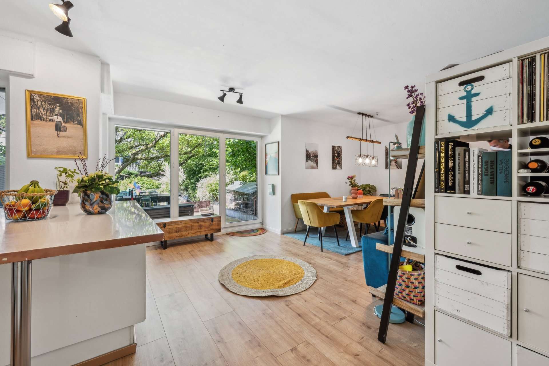 Die Wohnung überzeugt durch einen gut durchdachten Grundriss mit insgesamt zwei Schlafzimmern, einem innenliegendem Badezimmer, einem Gäste-WC, sowie einem großzügigem, hellem und offenem Wohn-/Essbereich inkl. Küche, der mit gemütlichem Holzboden ausgestattet ist. Von diesem Mittelpunkt der Wohnung aus haben Sie direkten Zugang zu Ihrer privaten Terrasse und dem Garten und genießen von innen einen schönen Blick ins Grüne. Die Fenster aus Kunststoff mit 2-fach-Verglasung sorgen für angenehme Lichtverhältnisse und gute Wärmedämmung.