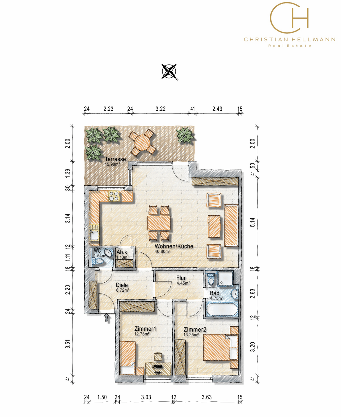• Wohn-/ Esszimmer inkl. Küche: 40,80 m²