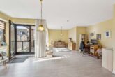 • Offenes Wohn-/ Esszimmer mit hellem Laminatboden, großer Fensterfront und Zugang zur überdachten Loggia