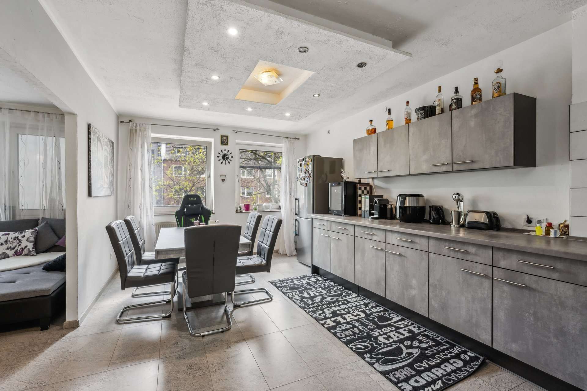 Der großzügige Wohn- und Essbereich empfängt Sie mit viel Tageslicht dank der breiten Fensterfront zur Straßenseite. Zeitgemäße, großformatige Fliesen sorgen hier – wie auch in Küche und Diele – für ein elegantes, pflegeleichtes Ambiente. Die voll ausgestattete Einbauküche überzeugt mit Spülmaschine, Gasherd und einer Dunstabzugshaube mit integriertem Filter.