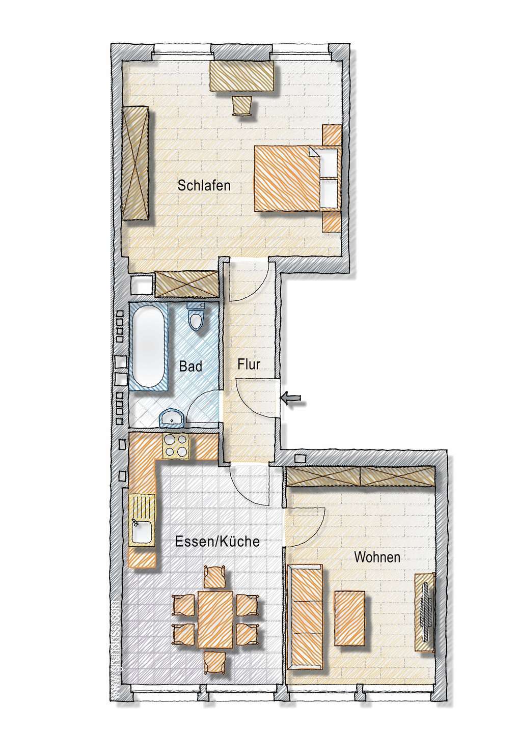 Durch die Diele erreichen Sie das Schlafzimmer - ein ruhiger Rückzugsort mit hellem Laminatboden und Nord-West Ausrichtung zum Hinterhof – ideal zum Entspannen. Die Fenster wurden teils 1978 (Wohnbereich, Küche), teils 1987 (Schlafzimmer) erneuert.