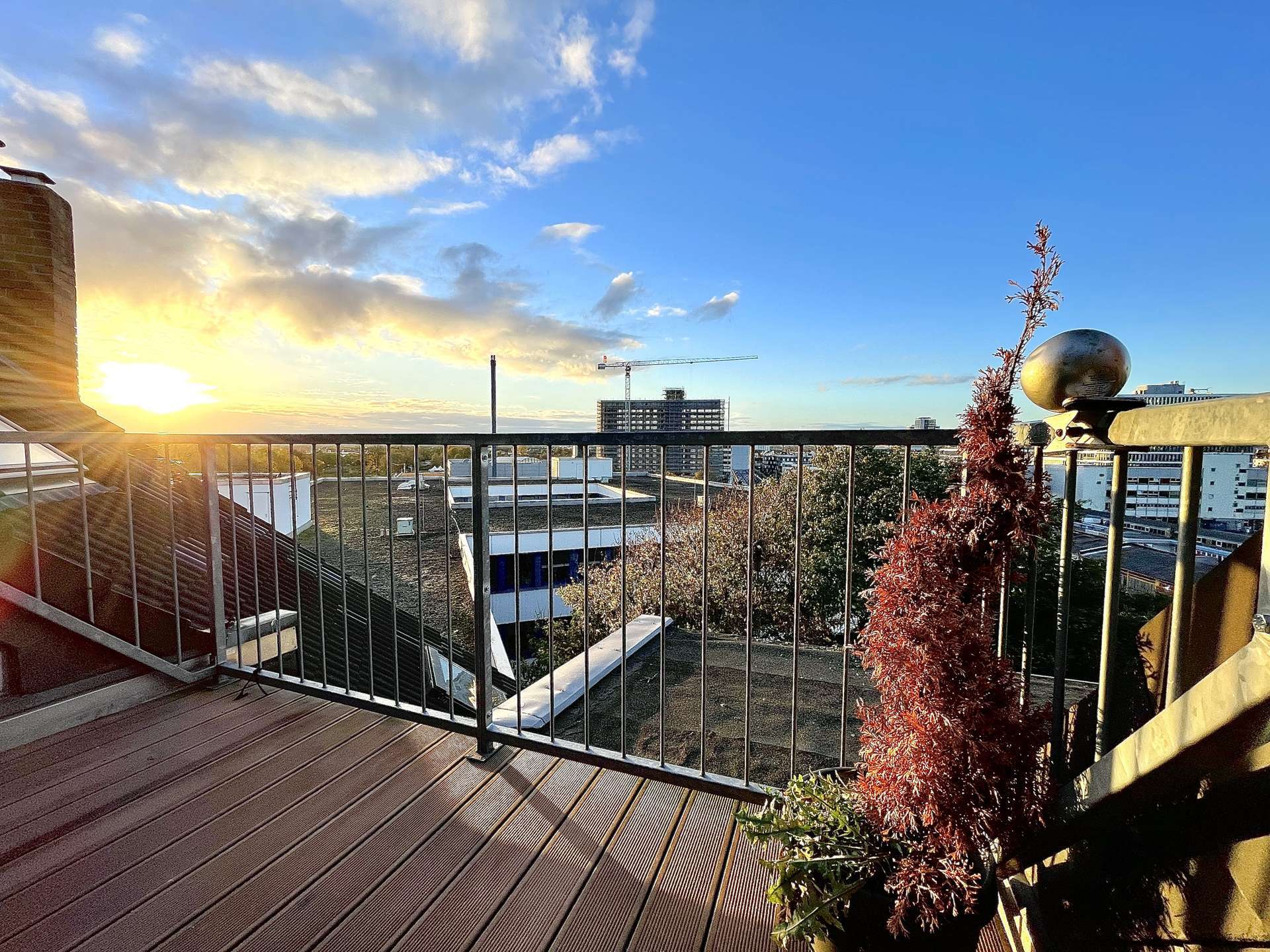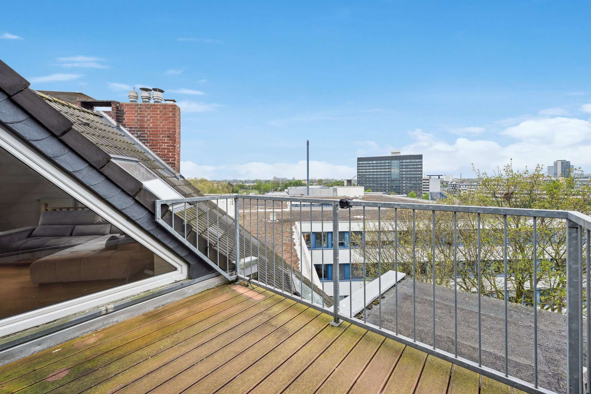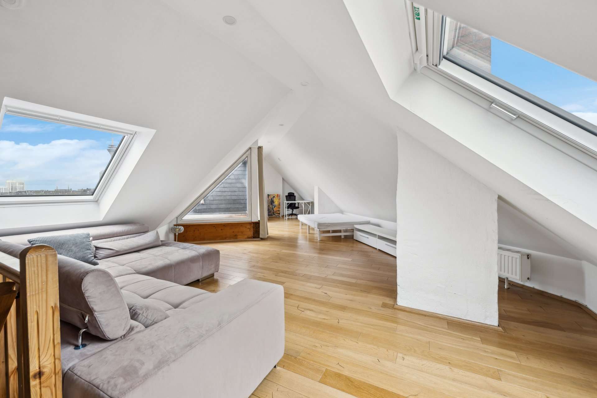 Über eine Treppe gelangt man ins Herzstück dieser Immobilie: den lichtdurchfluteten Wohnbereich im ausgebauten Spitzboden. Von hier öffnet sich der Zugang zur atemberaubenden Dachterrasse, die dank ihrer Weitblicklage zu entspannten Sonnenstunden, lauen Sommerabenden und privaten Genussmomenten einlädt – ein echtes Highlight über den Dächern Düsseldorfs.