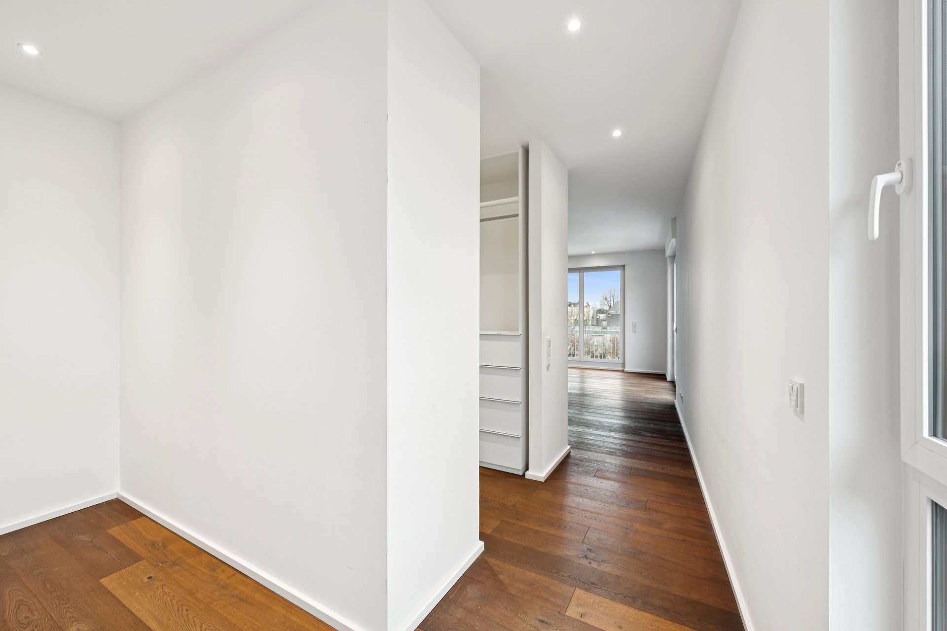 Ein echtes Highlight ist der private Masterbereich: Das großzügige Schlafzimmer verfügt über eine maßgefertigte Ankleide mit Schmuckvitrine, Krawatten- und Schuhablagen sowie integrierter Beleuchtung. Das luxuriöse Masterbad bietet ein Spa-ähnliches Erlebnis mit freistehender Badewanne und Rainforest-/Regendusche – ausgestattet mit hochwertigen Marken wie Gessi, Villeroy & Boch, Hansgrohe und Steinberg. Zusätzlich steht ein elegantes Gästebad mit Dusche zur Verfügung. Ein praktischer Hauswirtschaftsraum innerhalb der Wohnung sorgt für weitere Funktionalität und Ordnung.
