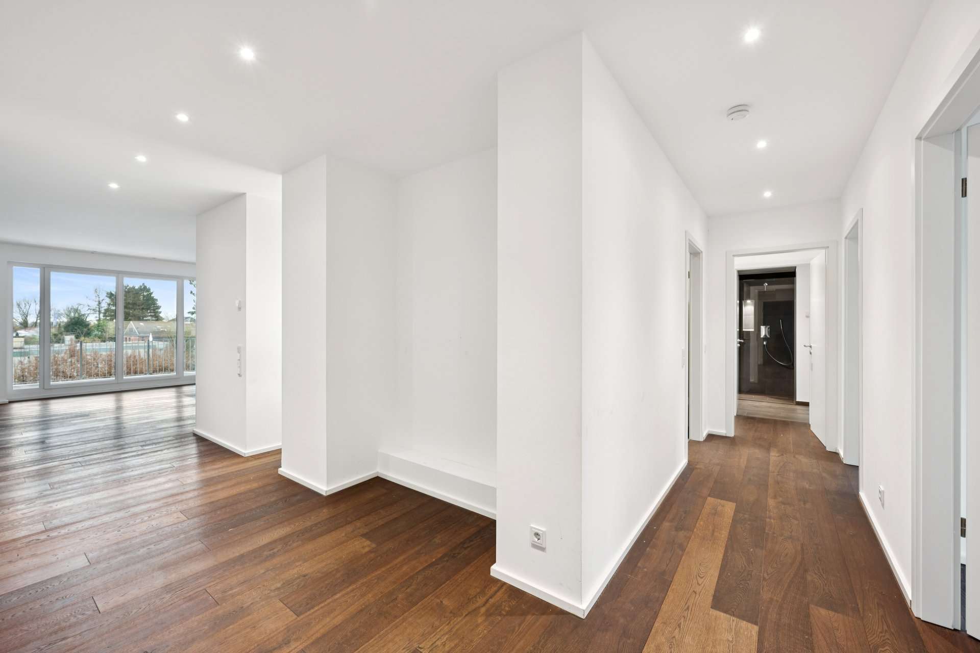 Für ein besonders angenehmes Wohngefühl sorgen Fußbodenheizung, dreifach verglaste Fenster, Außenrollläden sowie LED-Einbauspots in den Wohnbereichen. Edles Eichenparkett („Drüsedau“) und geschmackvolle Fliesen in Holzoptik in den Badbereichen unterstreichen den gehobenen Charakter der Wohnung bis ins Detail.
